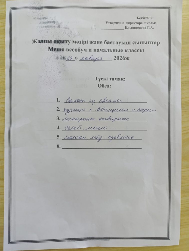 2026 жылғы 28 қантардағы мәзір
