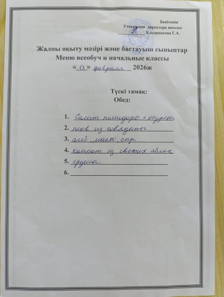 2026 жылғы 13 ақпандағы мәзір