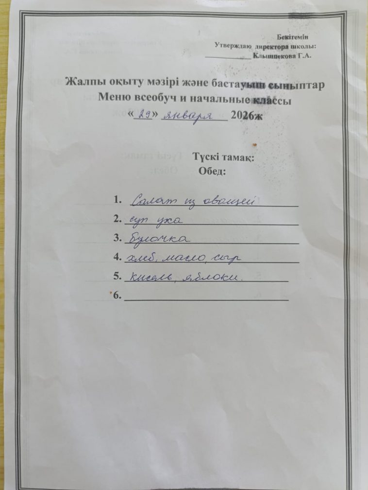 2026 жылғы 29 қантардағы мәзір